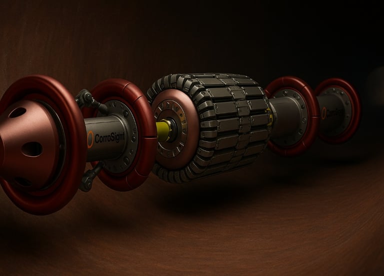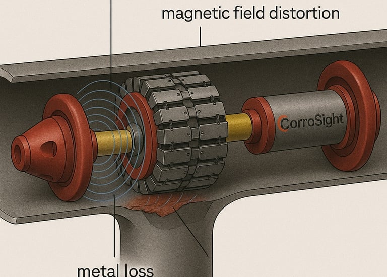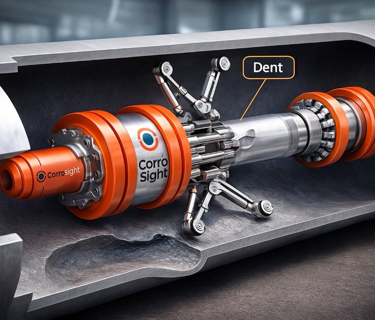 Our tool performs two major evaluations at once: magnetic flux leakage for corrosion detection and caliper measurement for geometric deformation. The high-density sensor layout allows us to detect very small changes in the magnetic field.